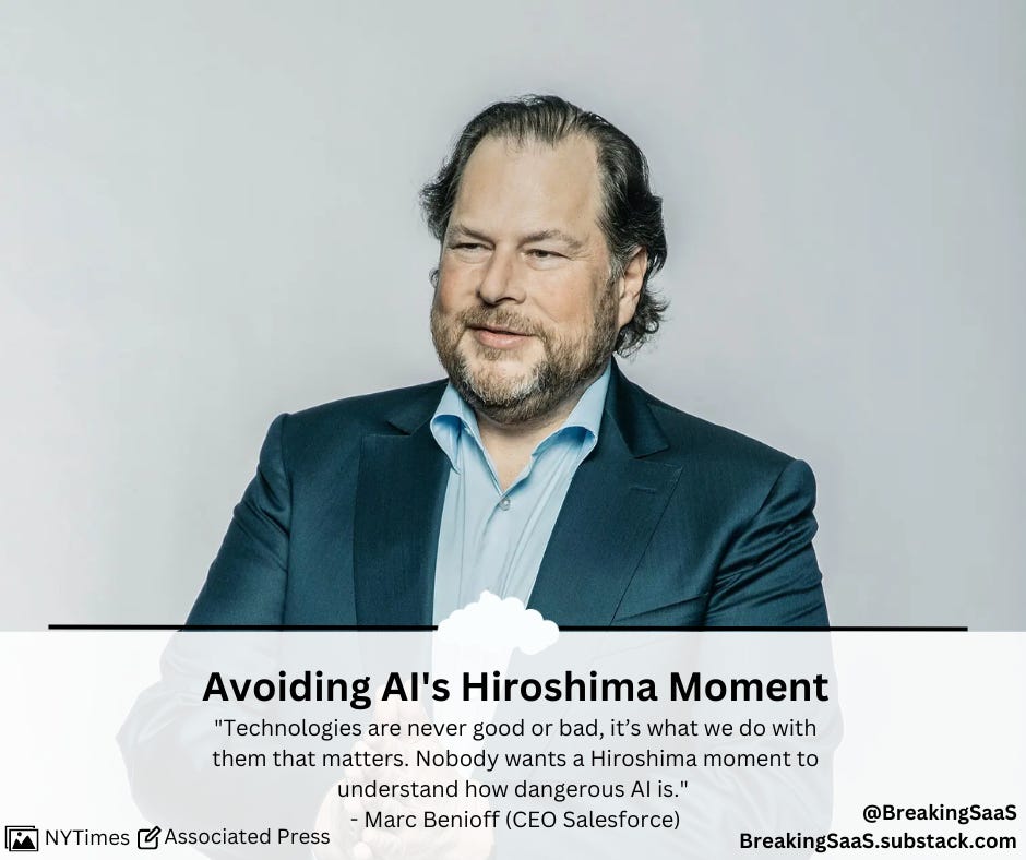 Marc Benioff remains one of AI’s most ardent supports while calling for guidelines before we face a “Hiroshima” moment to discover how dangerous the technology might be: