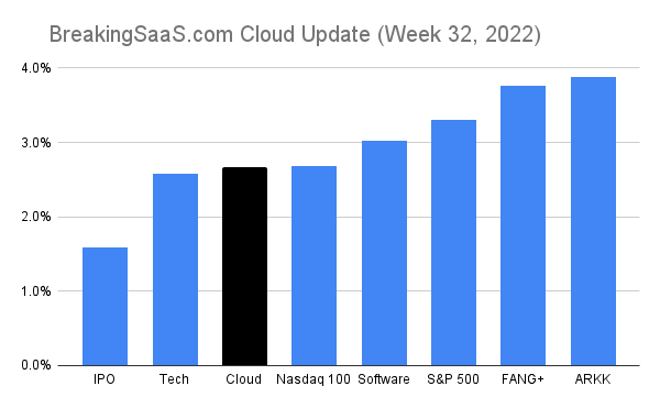 Cloud stocks jumped 2.7% for the week ending August 12, 2022 as CPI came in lower than feared. This week's performance followed an 11.8% increase last week, marking the first back-to-back weekly increase since early February. Cloud stocks are now down ~35% YTD vs. a low of ~48% in mid-June.